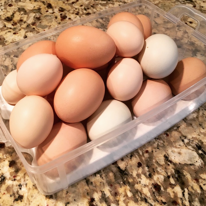 When we arrived back on Sunday afternoon from the mountains, our chicken-sitting neighbors had some great stories but they were somewhat disappointed that the hens did not produce as many eggs while we were gone as they did when we’re home. It had been extremely hot in Charlotte for the week, so that may have accounted for some drop in productivity. Or it also could have been some stress in having temporary care-takers. Who knows really??